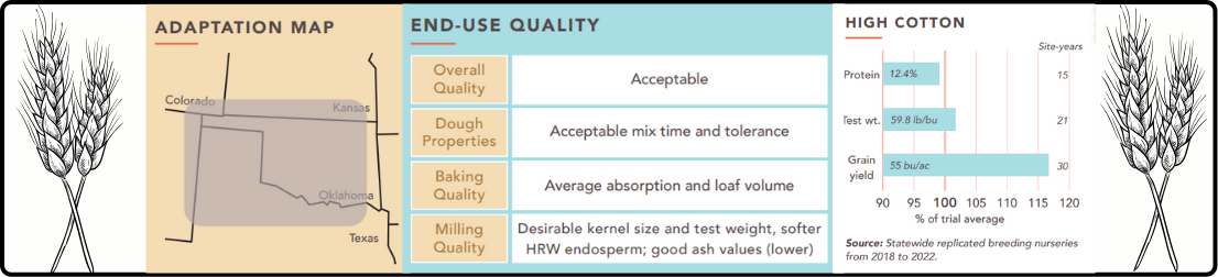 Developed by Oklahoma State University, High Cotton (OK18510) pulls together the best genetics from both U.S. and international wheat lines to deliver outstanding yields, strong disease resistance, and the flexibility needed for both grain harvest and early-season grazing. In statewide trials, High Cotton has repeatedly surpassed the performance of popular varieties – producing 5-13 more bushels per acre and ranking at or near the top for test weight and grain quality. Its built-in resistance to leaf and stripe rust reduces risk and helps lower input costs, while its reliable milling and baking qualities make it a strong choice for commercial production and the end market. High Cotton’s combination of genetic diversity, disease protection, and dual-purpose adaptability makes it an excellent fit for Oklahoma’s production systems and supports the long-term sustainability of the state’s wheat industry.