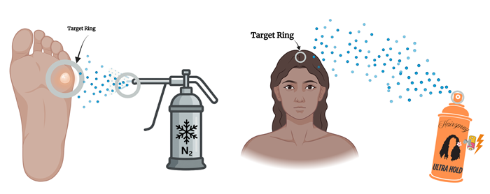 Oklahoma State researchers have developed an innovative solution for precisely and accurately delivering personal spray products to the human body using an established DC electrical field. A metallic nozzle replaces any product’s traditional plastic lid with a metal ring that establishes an electrical field with the target ring placed on the desired area to guide mist droplets to the area of interest. This approach reduces product loss and increases the delivery efficiency of aerosol products from personal hygiene products like perfumes and hairsprays regardless of container composition, to medical procedures such as targeted cryotherapy.