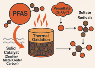 Oklahoma State researchers have created a PFAS destruction process based on thermal oxidation that uses solid reaction support materials together with thermally activated sulfate radicals to break the strong C-F bonds in PFAS at moderate temperatures (~60-90 °C). This innovation offers a scalable, cost-effective, and environmentally safe alternative to high-energy technologies by driving PFAS remineralization products such as fluoride ions, CO2 and sulfate ions, without relying on high temperature, UV, electrochemical or supercritical conditions. This approach is compatible with a broad range of solid reaction support materials, can treat both dissolved PFAS and those adsorbed on solid sorbents, and is adaptable to in situ or ex situ configurations, making it well suited for industrial, municipal, and environmental remediation settings. By directly addressing the current gap between simple separation and true destruction under practical operating conditions, this technology is positioned to help regulated entities meet tightening PFAS standards while minimizing energy use, secondary waste, and toxic byproduct formation.